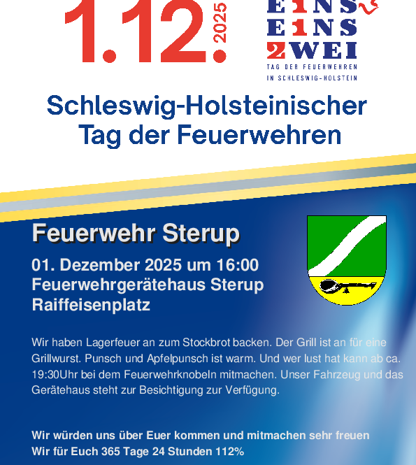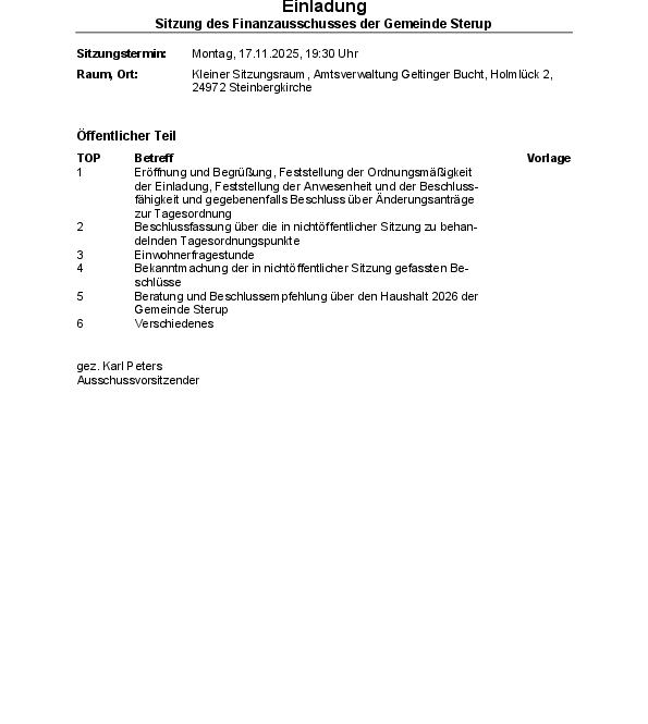 Die nächste Sitzung der Steruper Gemeindevertretung findet am Dienstag 25. November 2025 statt.