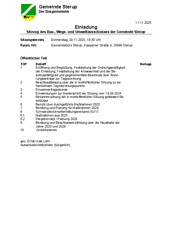 20. November 2025 Sitzung des Bau- Wege und Umweltausschusses